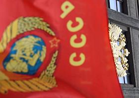 Виды Москвы. Охотный ряд. Жанровая фотография. Красный флаг с символикой СССР на фоне здания…
