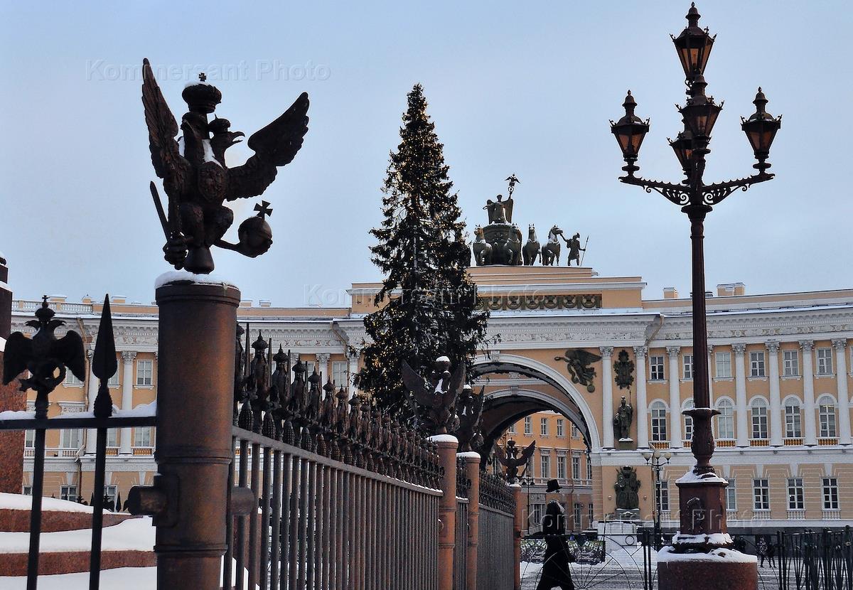 Виды Санкт-Петербурга. Жанровая фотография. Установка новогодней ели на Дворцовой площади.