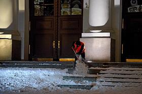 Жанровая фотография. Сотрудник коммунальной службы города убирает снег со ступеней входа в…