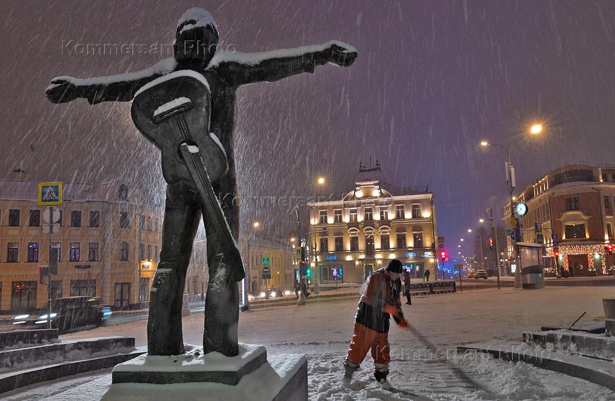 Виды вечерней Москвы во время снегопада. Памятник актеру, поэту Владимиру Высоцкому на Страстном…