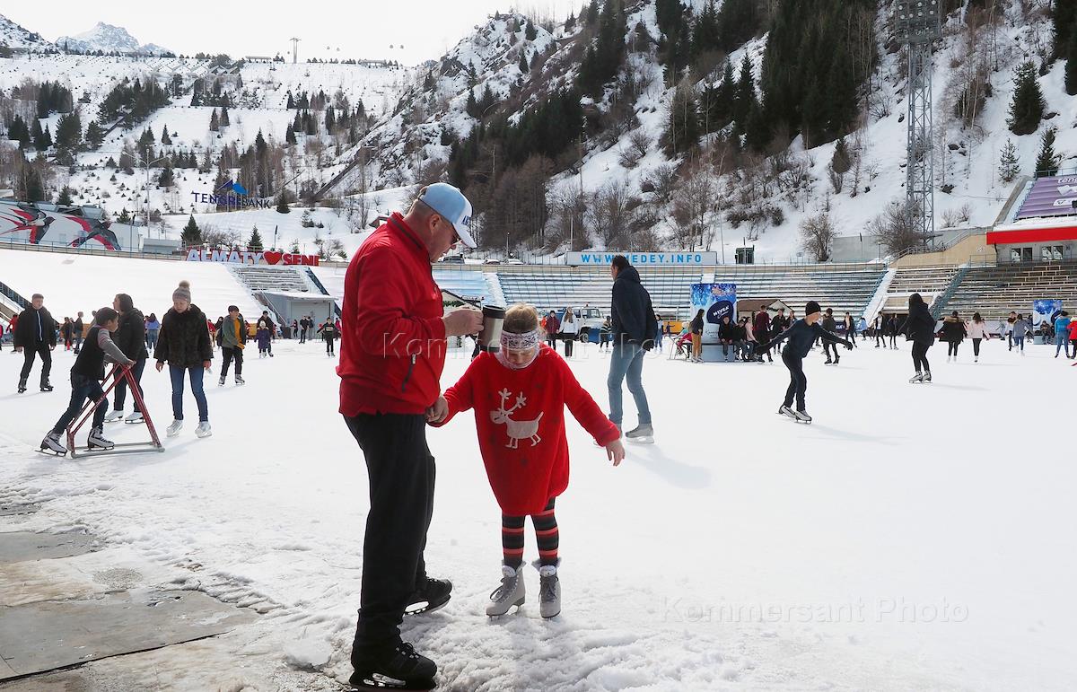 Виды Алма-Аты. Жанровая фотография. Люди катаются на коньках на высокогорном спортивном конькобежном…