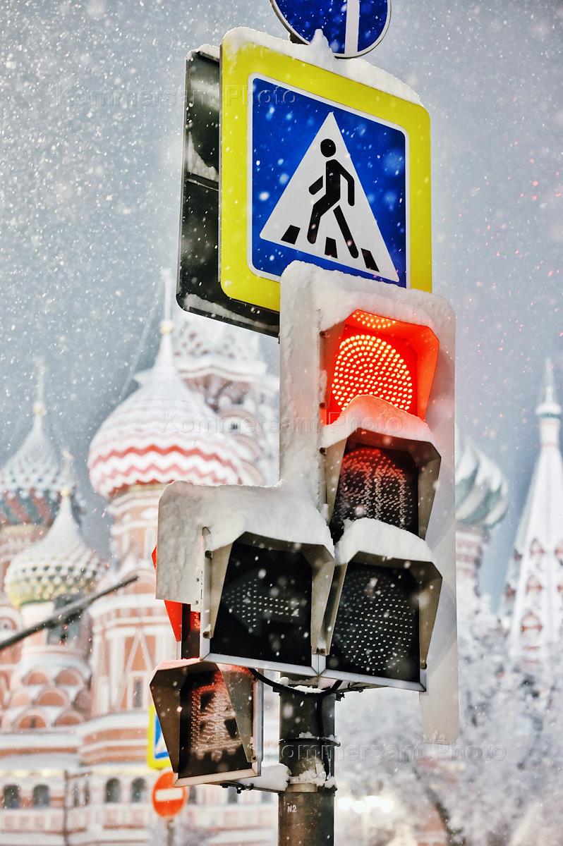 Виды Москвы. Снегопад в городе. Жанровая фотография. Светофор на фоне Храма Василия Блаженного.