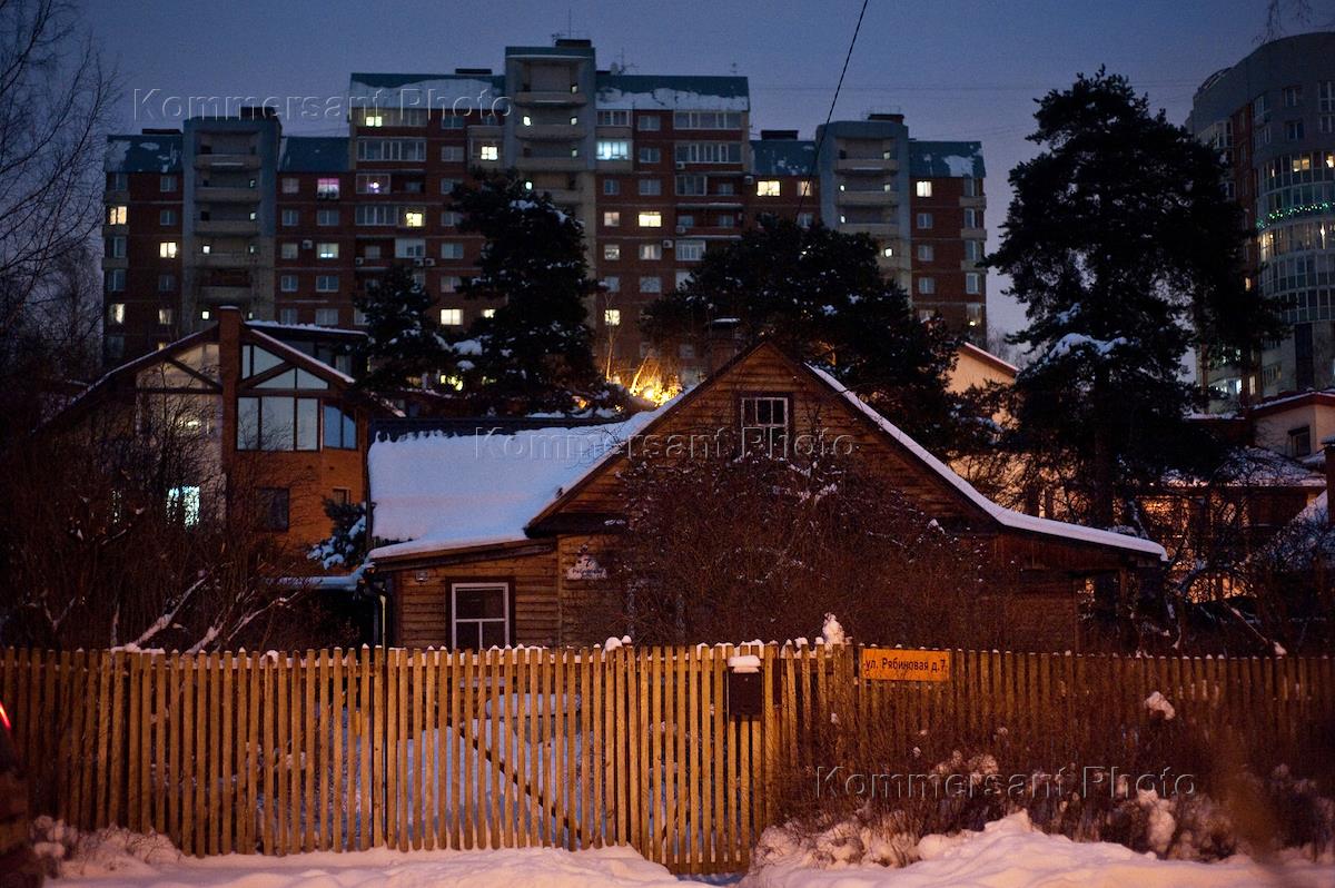 Виды Санкт-Петербурга. Жанровая фотография. Одноэтажный частный дом на фоне многоэтажного жилого…