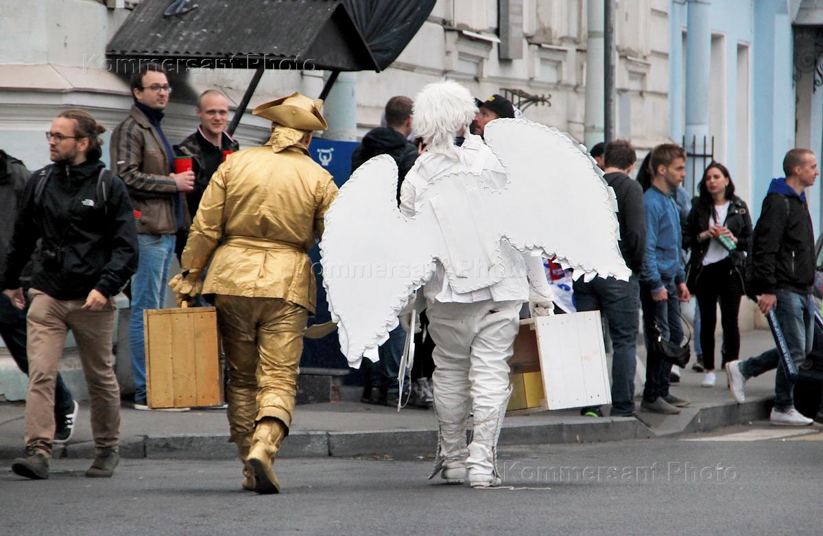 Виды Санкт-Петербурга. Жанровая фотография. Уличный артист в костюме белого ангела после выступления.