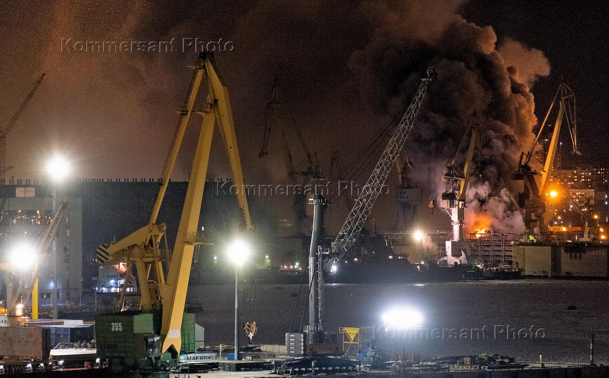 Загоревшийся корабль на судостроительном заводе "Северная верфь" в Санкт-Петербурге.