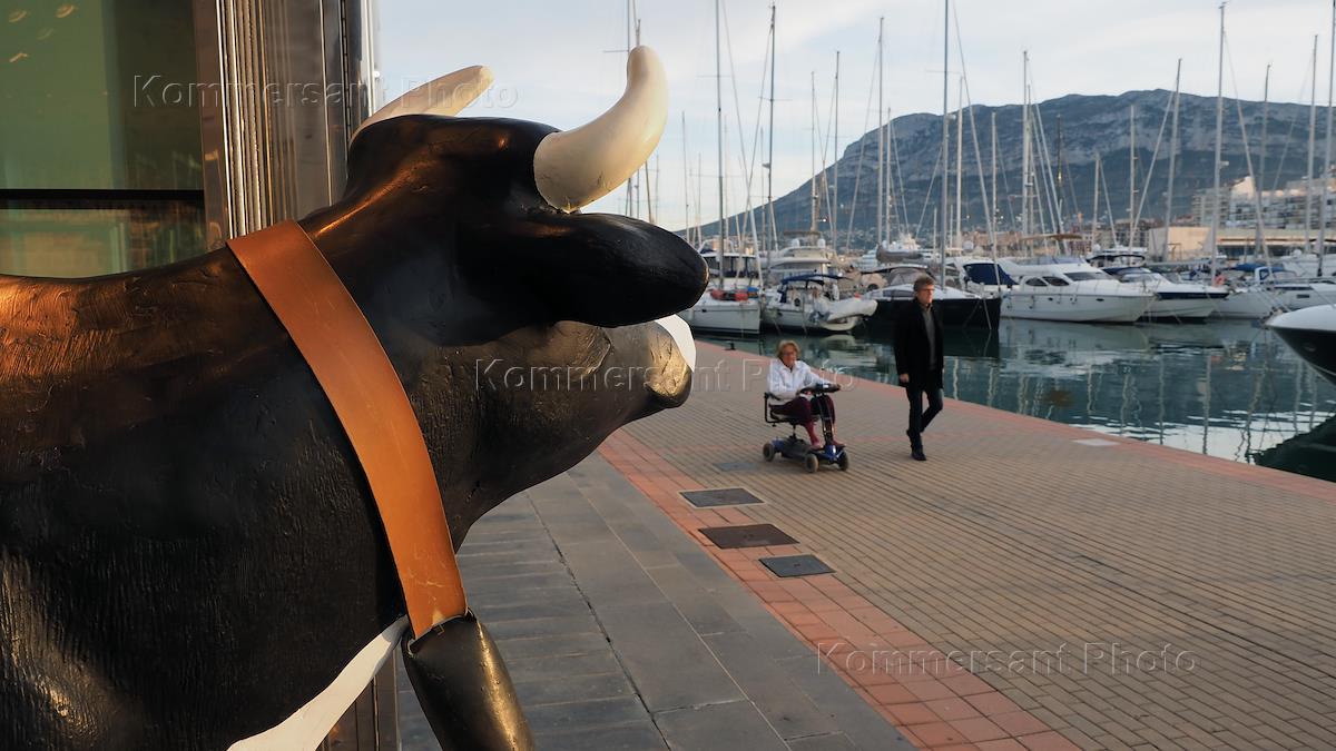 Валенсия, провинция Аликанте, Коста Бланка. Фигура коровы - оформление ресторана на причале марины.