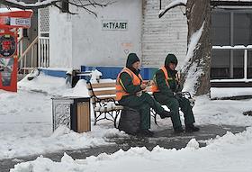 Виды Севастополя после снегопада. Жанровая фотография. Сотрудники коммунальной службы сидят на…
