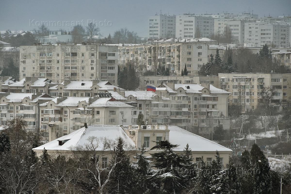 Виды Севастополя после снегопада. Жанровая фотография. Жилые дома, запорошенные снегом.