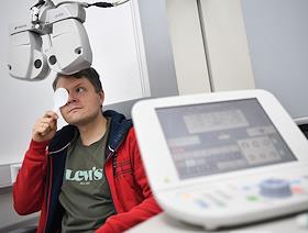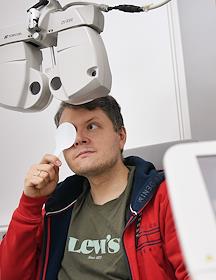 Пациент во время проверки зрения в ФГАУ "НМИЦ "МНТК "Микрохирургия глаза" имени академика…