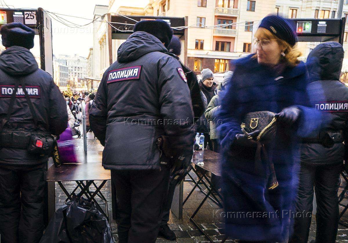 Жанровая фотография. Новогодние праздники в городе. Люди проходят через металлоискатель на Красную…