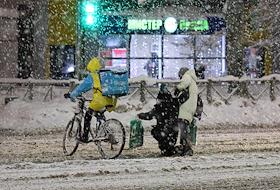 Виды Казани во время снегопада. Жанровая фотография. Курьер службы доставки сервиса "Яндекс. Лавка"…