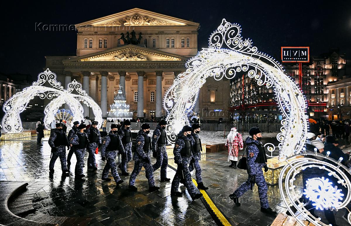 Виды новогодней Москвы. Жанровая фотография. Сотрудники полиции в районе Театральной площади во…