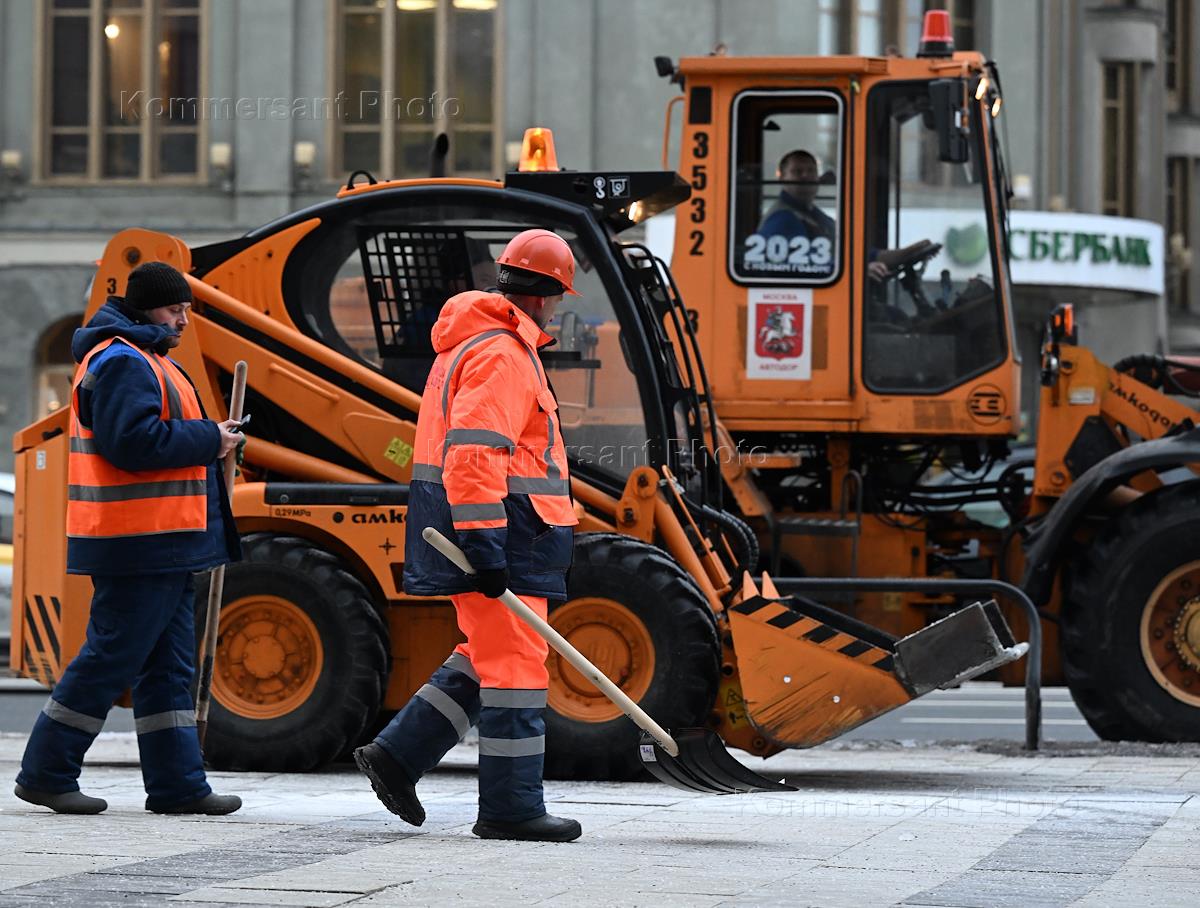 Виды Москвы. Жанровая фотография. Гололед на улицах города. Уборка тротуаров от льда.