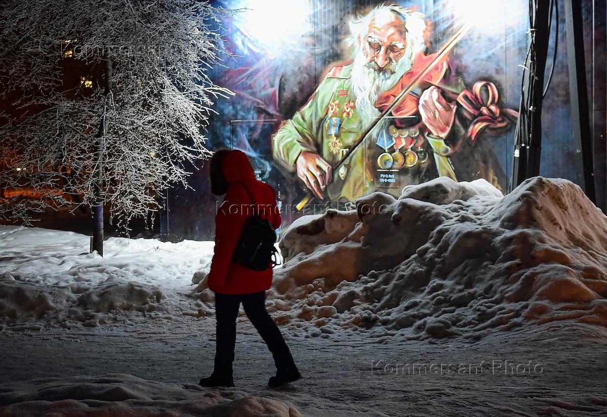 Виды Новосибирска. Жанровая фотография. Рисунок на стене с изображением пожилого человека в военной…