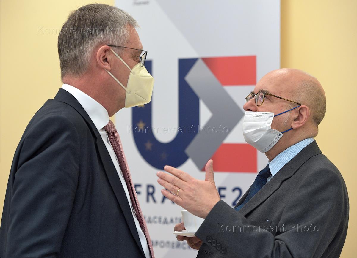 Политика Совместный брифинг Чрезвычайного и полномочного посла Французской Республики в России Пьера Леви и посла Европейского Союза в России Маркуса Эдерера в Представительстве ЕС России.