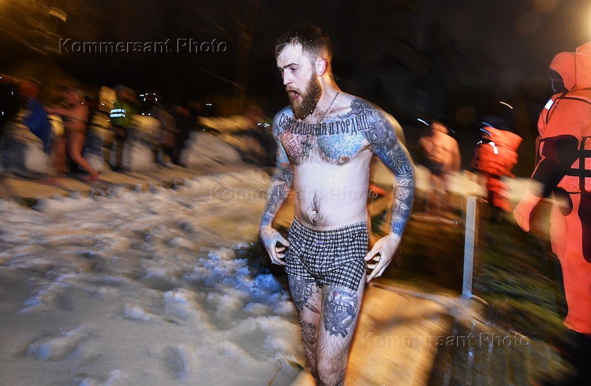 Праздник Крещения Господня. Священнослужитель во время обряда освящения проруби в пруду Зеленка.