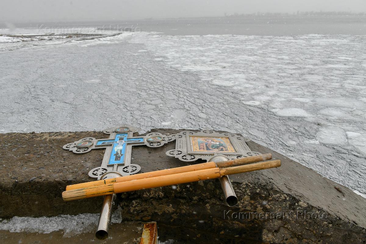 Праздник Крещения Господня. Чин водоосвящения реки Волги. Жанровая фотография. Икона Богоматери.