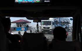 Виды Узбекистана. Шоссе Бухара - Хива. Жанровая фотография. Автовоз на мосту через реку Амударью.