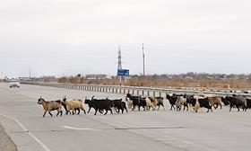 Виды Узбекистана. Шоссе Бухара - Хива. Жанровая фотография. Стадо коз переходит дорогу.
