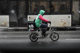 Виды Санкт-Петербурга. Жанровая фотография. Курьер службы доставки еды на велосипеде.