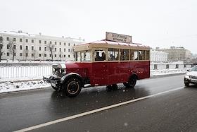 Виды Санкт-Петербурга во время снегопада. Жанровая фотография. Экскурсионный ретроавтобус на одной…