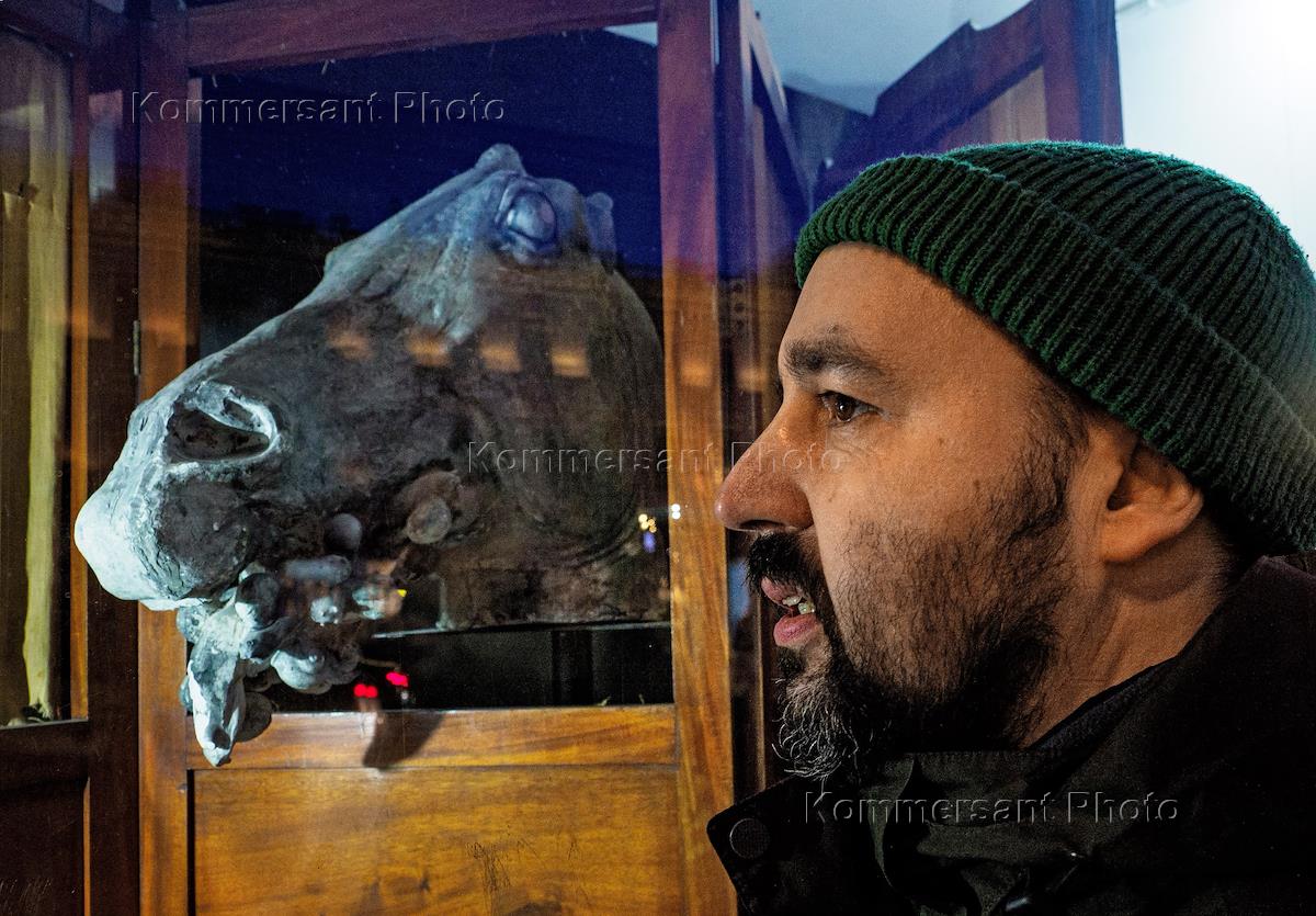 Жанровая фотография. Мужчина и скульптура голова лошади.