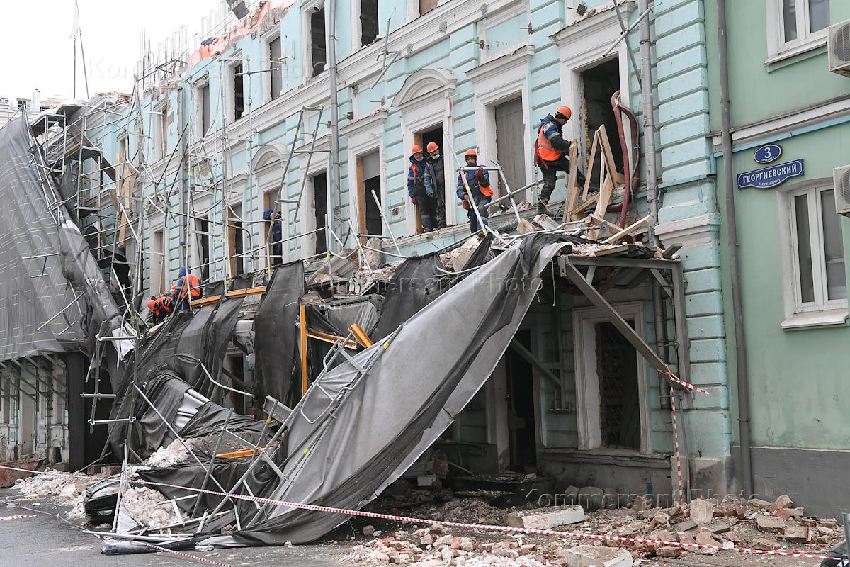 Последствия обрушения строительных лесов на припаркованные автомобили в Георгиевском переулке…