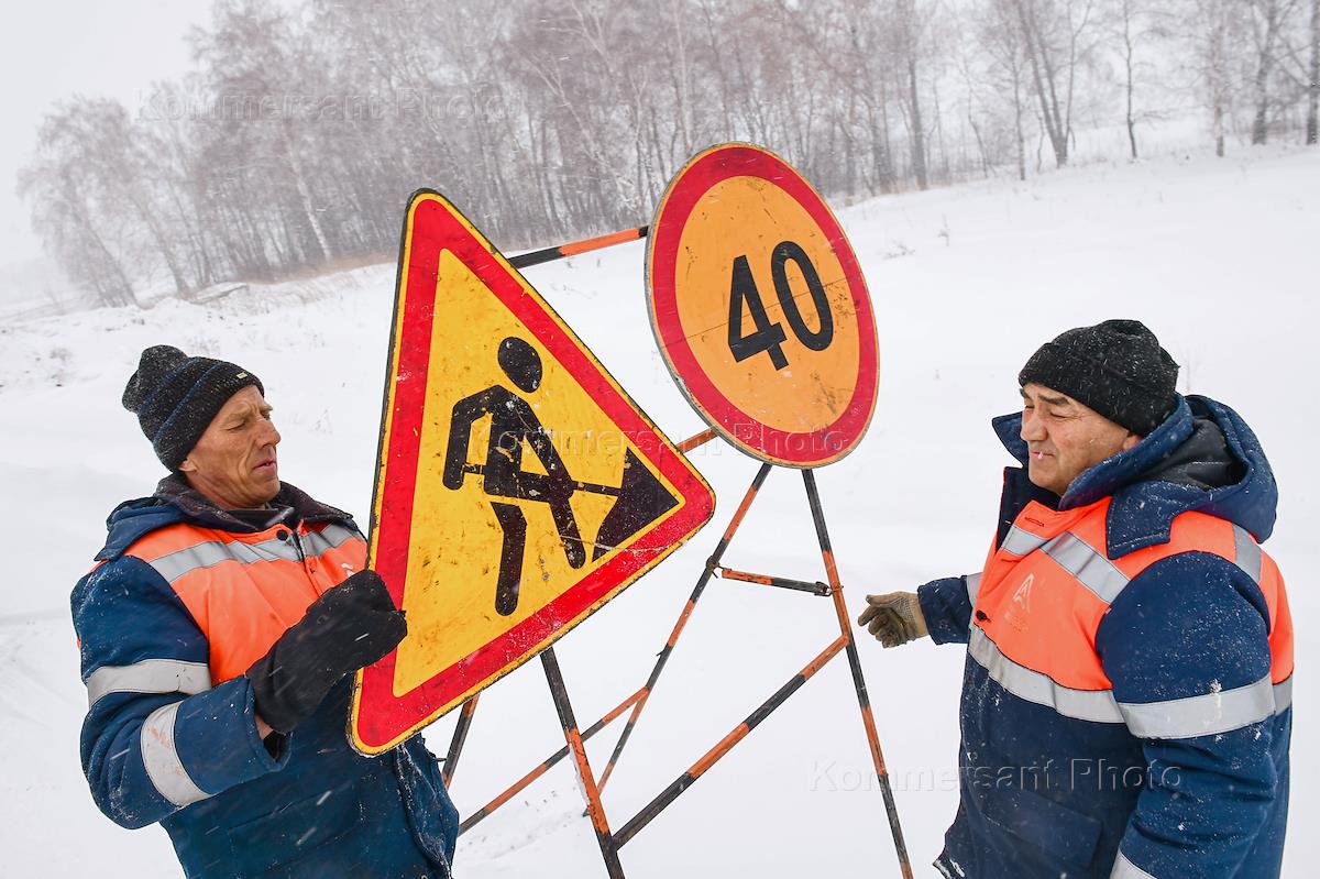 Жанровая фотография. Работники дорожной службы во время очистки участка федеральной трассы от снега…