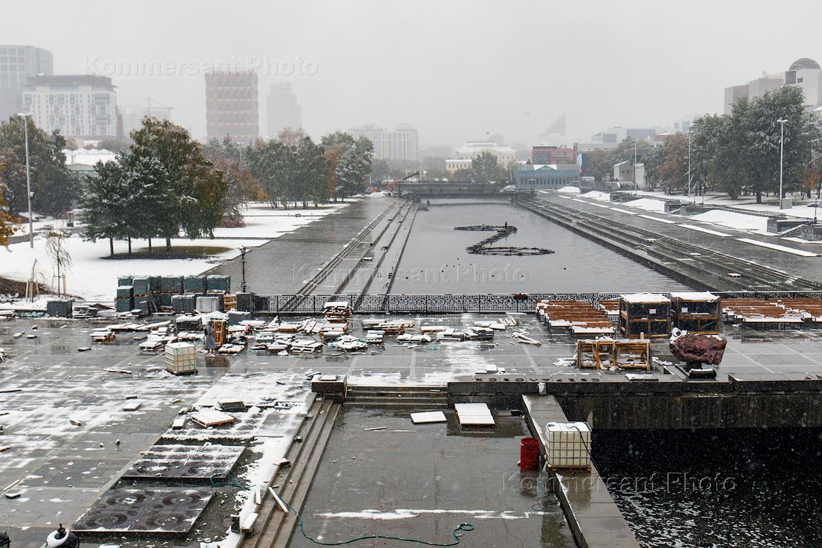Жанровая фотография. Снегопад в Екатеринбурге. Набережная реки Исеть. Плотинка.