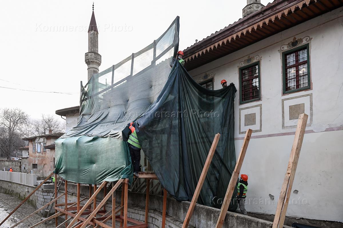 Реставрация Ханского дворца в Бахчисарае. На стене здания Свитского корпуса Ханского дворца, вокруг…