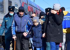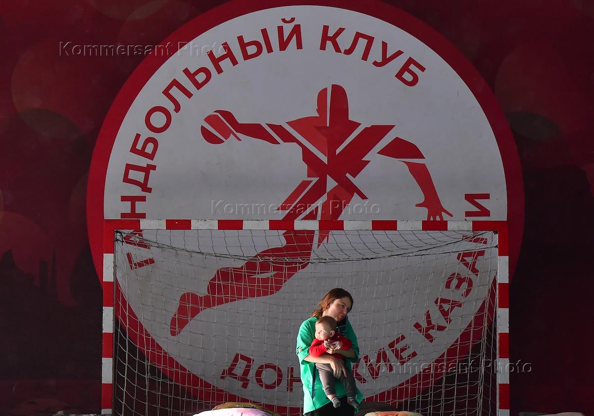Беженцы из ДНР в пункте временного размещения беженцев в спортивной школе №13 в Таганроге.