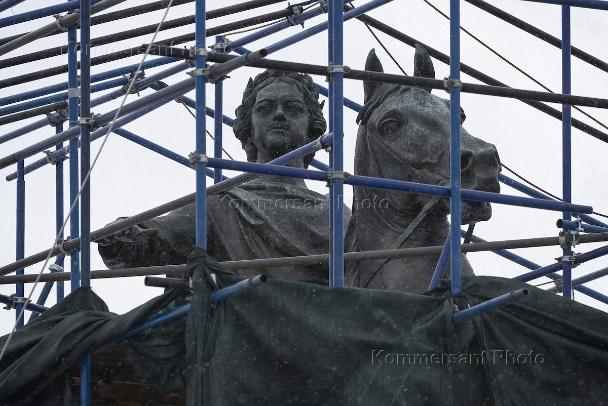 Демонтаж строительных лесов с памятника императору Петру Первому "Медный всадник" на Сенатской площади.