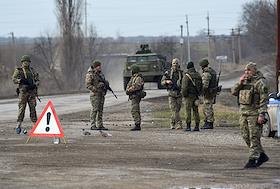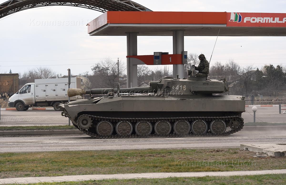 Ситуация на российско-украинской границе. Военнослужащие и военная техника на блок-посту на выезде…