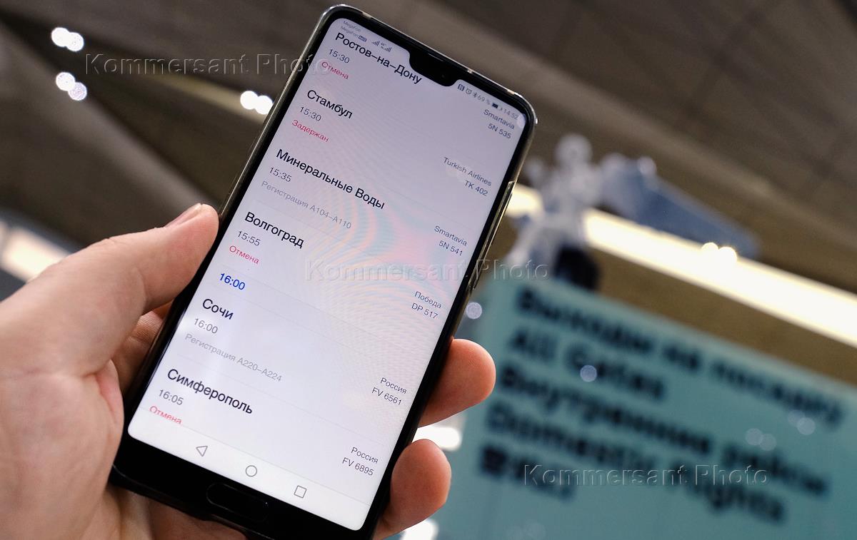 Жанровая фотография. Приложение на мобильном телефоне пассажира с расписанием отмененных вылетов и…