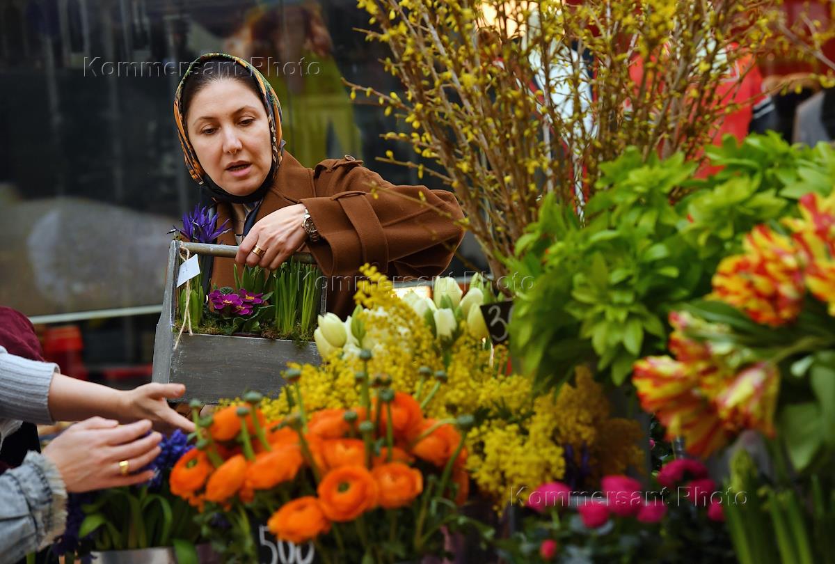 Цветочный базар в Петровском Пассаже. Продажа ранункулюсов (лютиков), тюльпанов и мимозы.