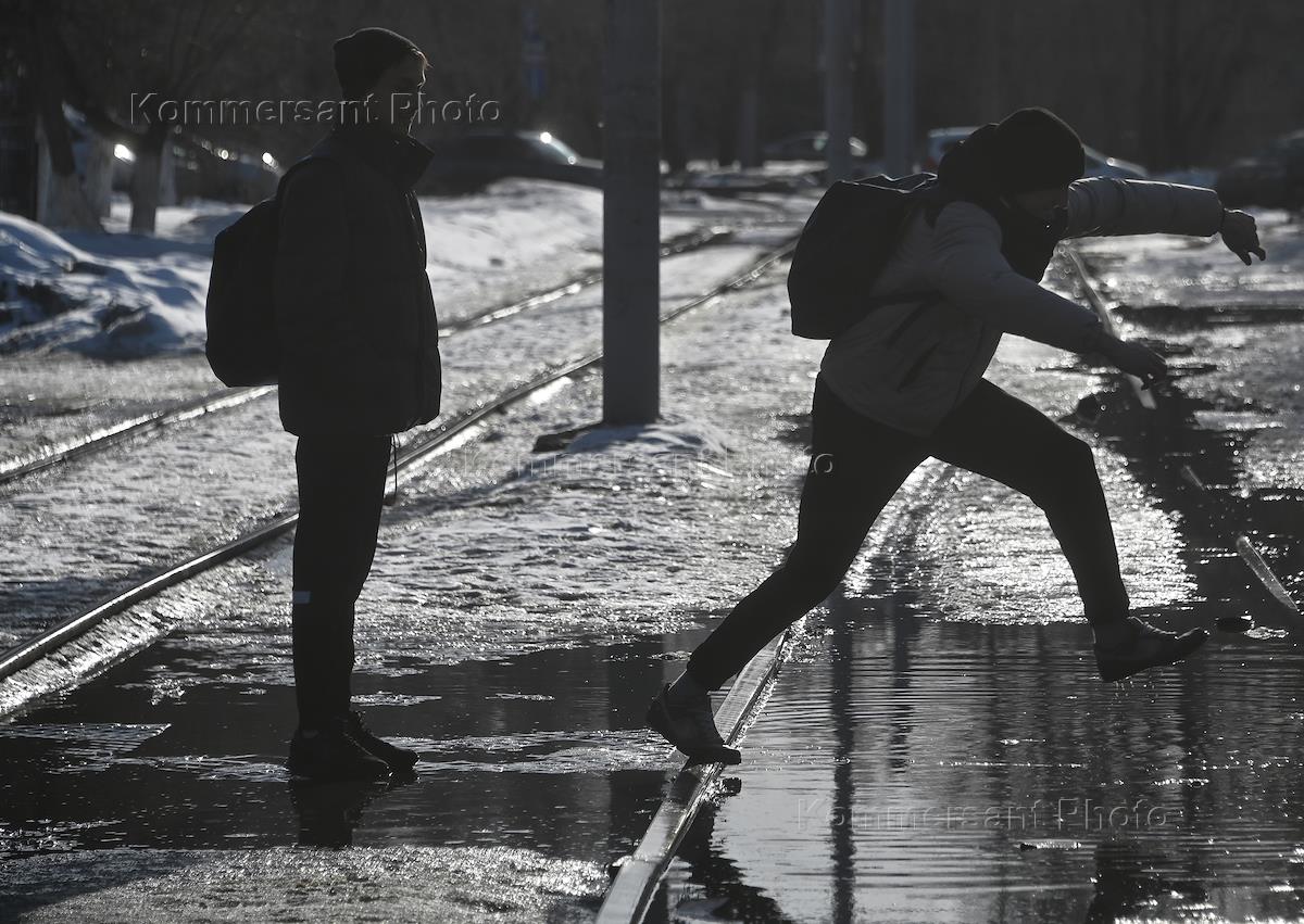 Жанровая фотография. Оттепель в городе. Люди переходят трамвайные пути по луже воды.