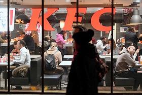Жанровая фотография. Посетители ресторана быстрого питания KFC на территории фудкорта в торговом…