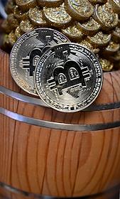 Криптовалюта. Жанровая фотография. Bitcoin (биткойн) и сувенирный денежный бочонок.