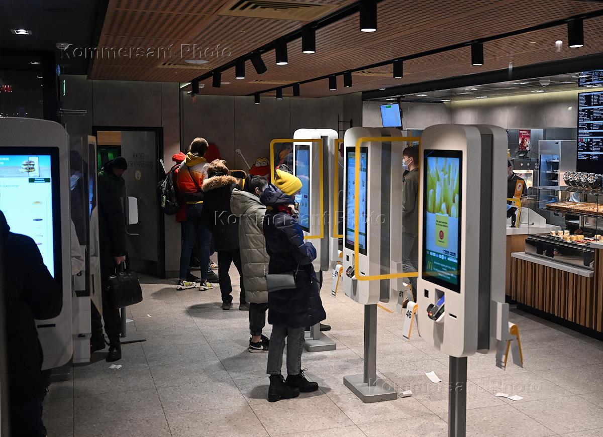 Посетители в ресторане быстрого питания "Макдоналдс" на Люсиновской улице. Американская компания…