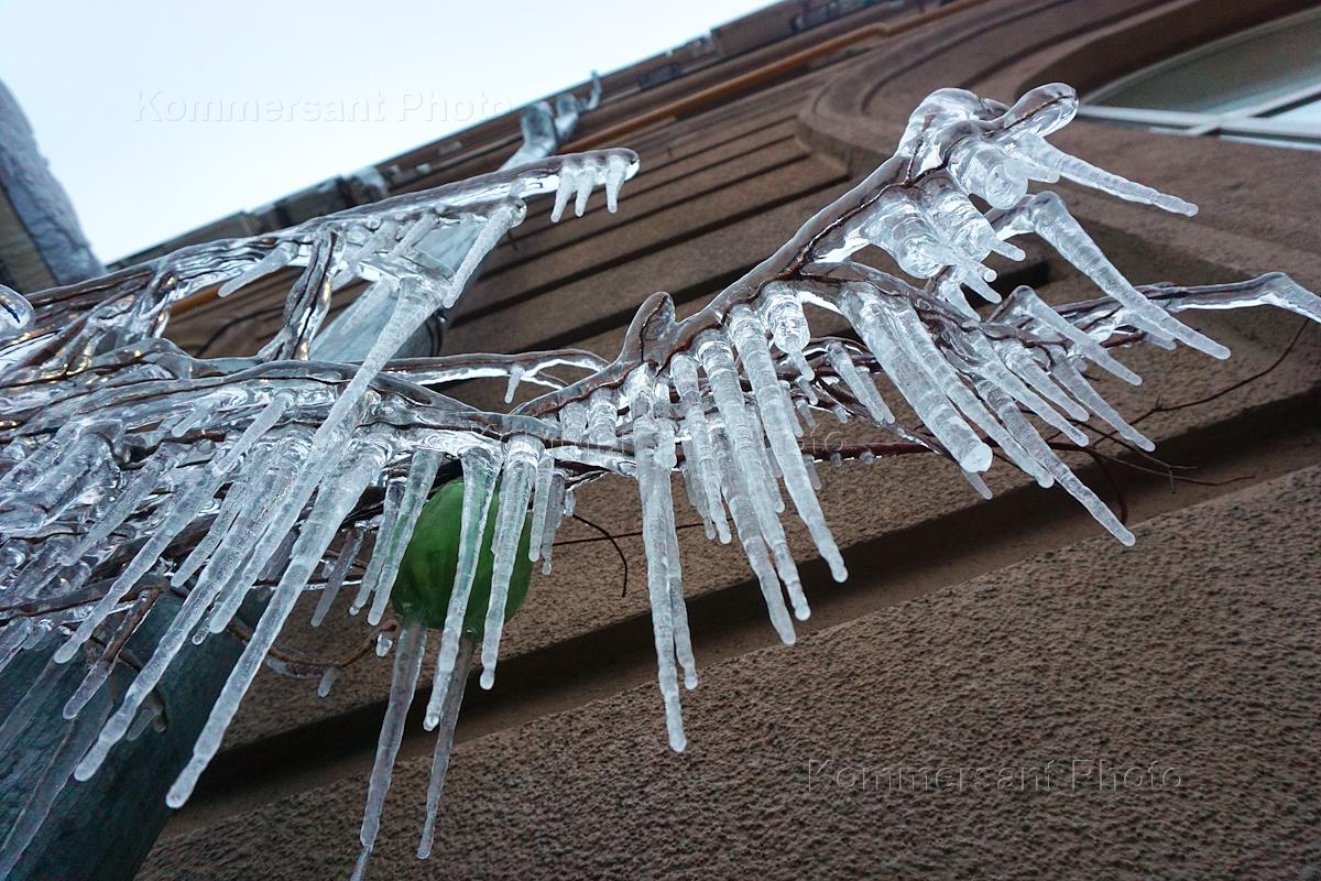 Жанровая фотография. Сосульки на ветке дерева после ледяного дождя.