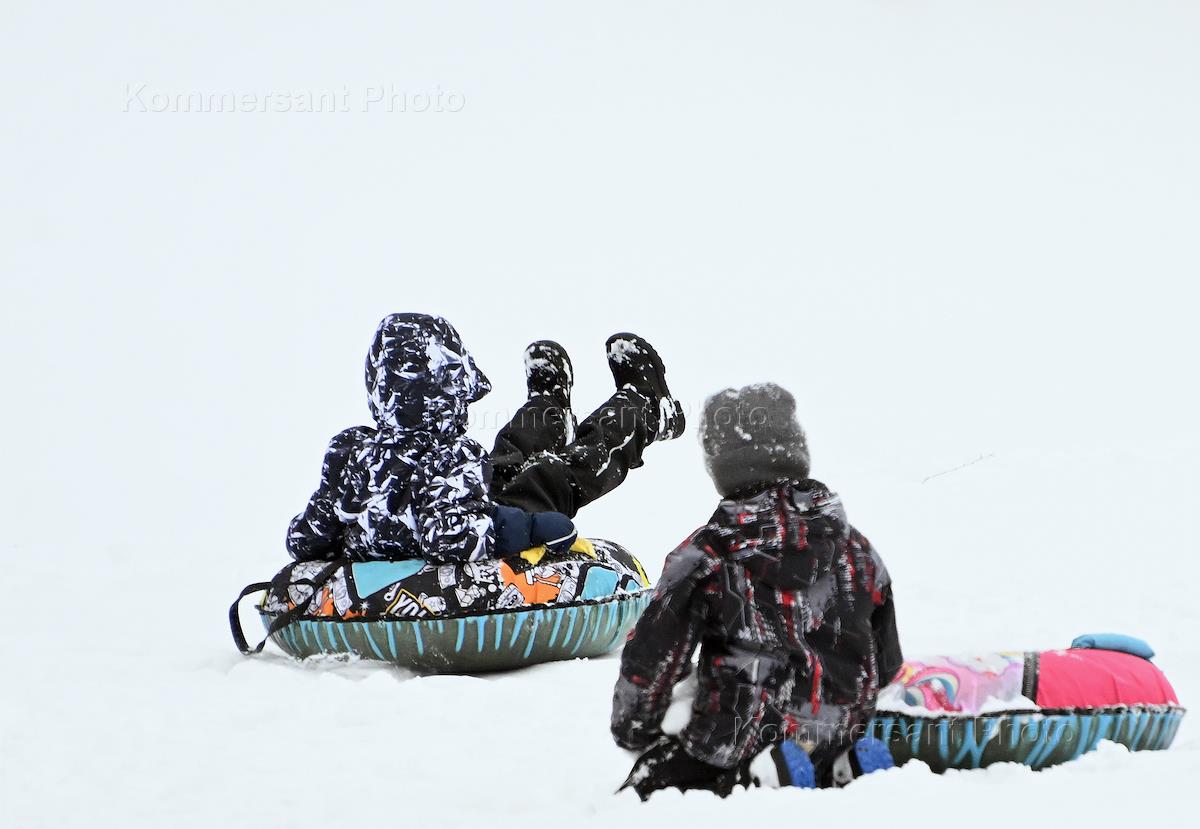 Виды Москвы после снегопада. Жанровая фотография. Дети катаются с горки.