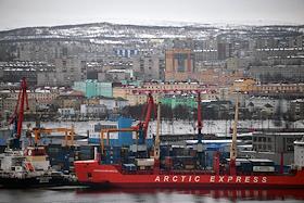Виды Мурманска. Жанровая фотография. Дизель-электроход "Арктик Экспресс" на фоне городских домов.