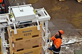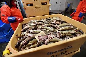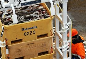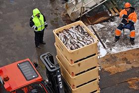 Пресс-тур на предприятия рыбопромышленного холдинга "Norebo". Рыба в пластиковых ящиках во время…