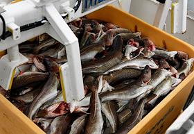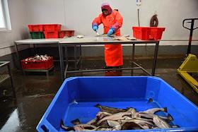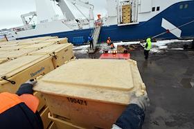 Пресс-тур на предприятия рыбопромышленного холдинга "Norebo". Обработанная рыба в пластиковых ящиках…