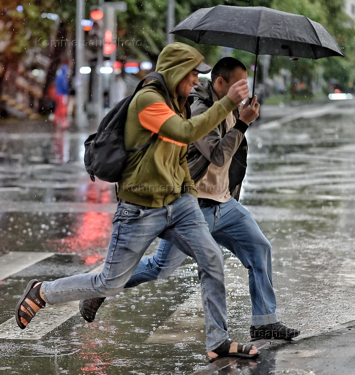 Виды Москвы во время грозы. Жанровая фотография. Молодые люди перепрыгивают лужу на наземном…