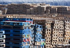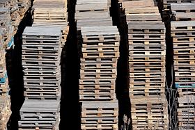 Жанровая фотография. Деревянные поддоны (паллеты) на территории транспортно-логистического центра.