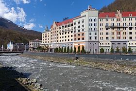 Виды Красной Поляны. Горнолыжный курорт "Роза Хутор". Отель Radisson на берегу река Мзымта.