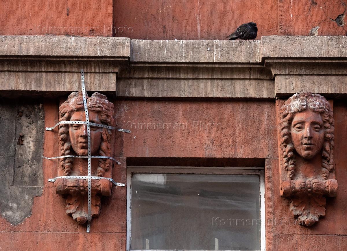 Маскарон на улице Большой Монетной, дом 6. Жанровая фотография. Элемент декора фасада дома,…