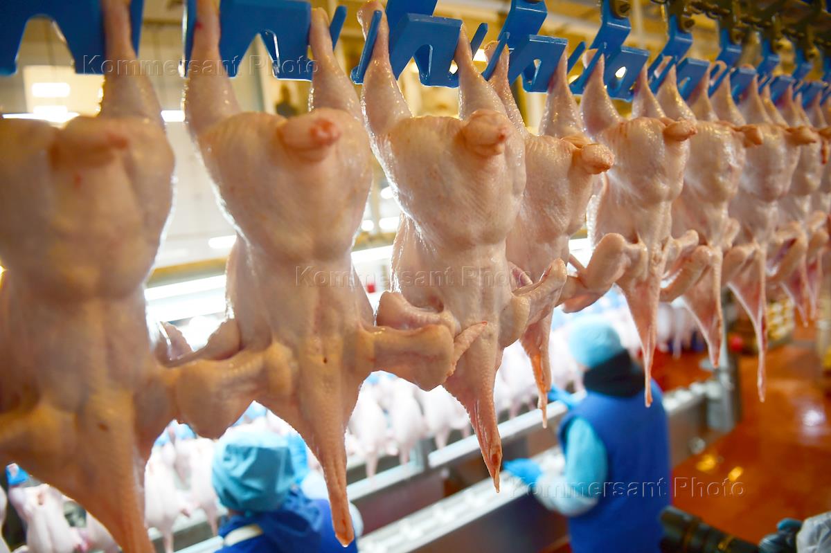 Агрохолдинг "Птицефабрика "Октябрьская" в Новосибирской области. Рабочие в цехе по переработке мяса…
