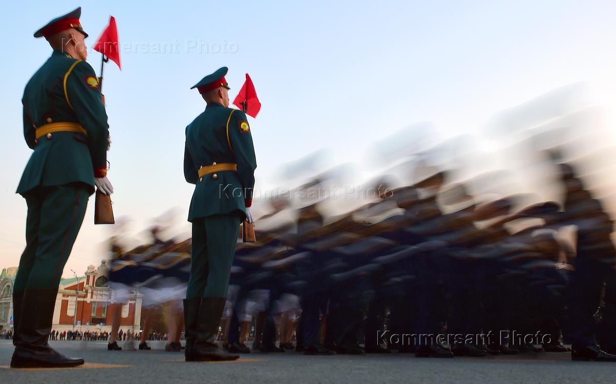 Военнослужащие во время репетиции парада Победы на площади имени Ленина в Новосибирске.